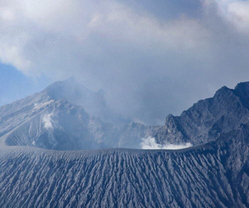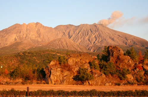 風が微かな硫黄の香りを運び、風向きによっては光に照らされた火山灰がキラキラと舞うことも。